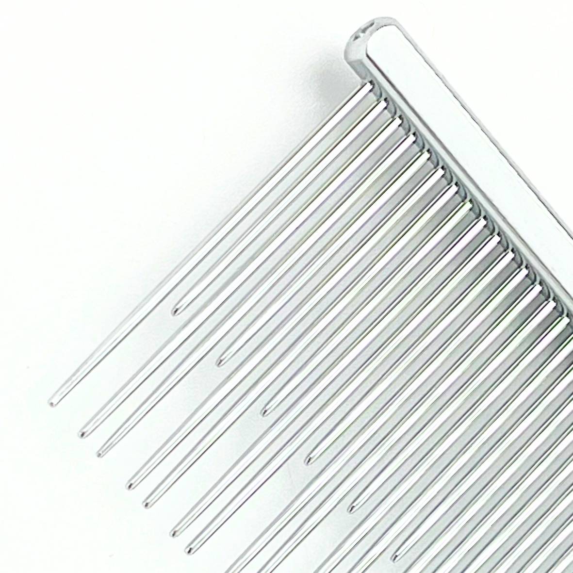 Dieser Profi-Kamm kombiniert einen hochwertigen Kupfergriff mit präzise verarbeiteten Edelstahl-Pins und ist auf zuverlässige Performance im Grooming-Alltag ausgelegt. Dank der zwei Pinlängen (35 mm und 24 mm) deckt er unterschiedliche Einsatzbereiche ab: Die längeren Pins unterstützen das Arbeiten im dichteren Fell und in tieferen Schichten, während die kürzeren Pins ideal für feinere Partien, Übergänge und das exakte Finish sind.